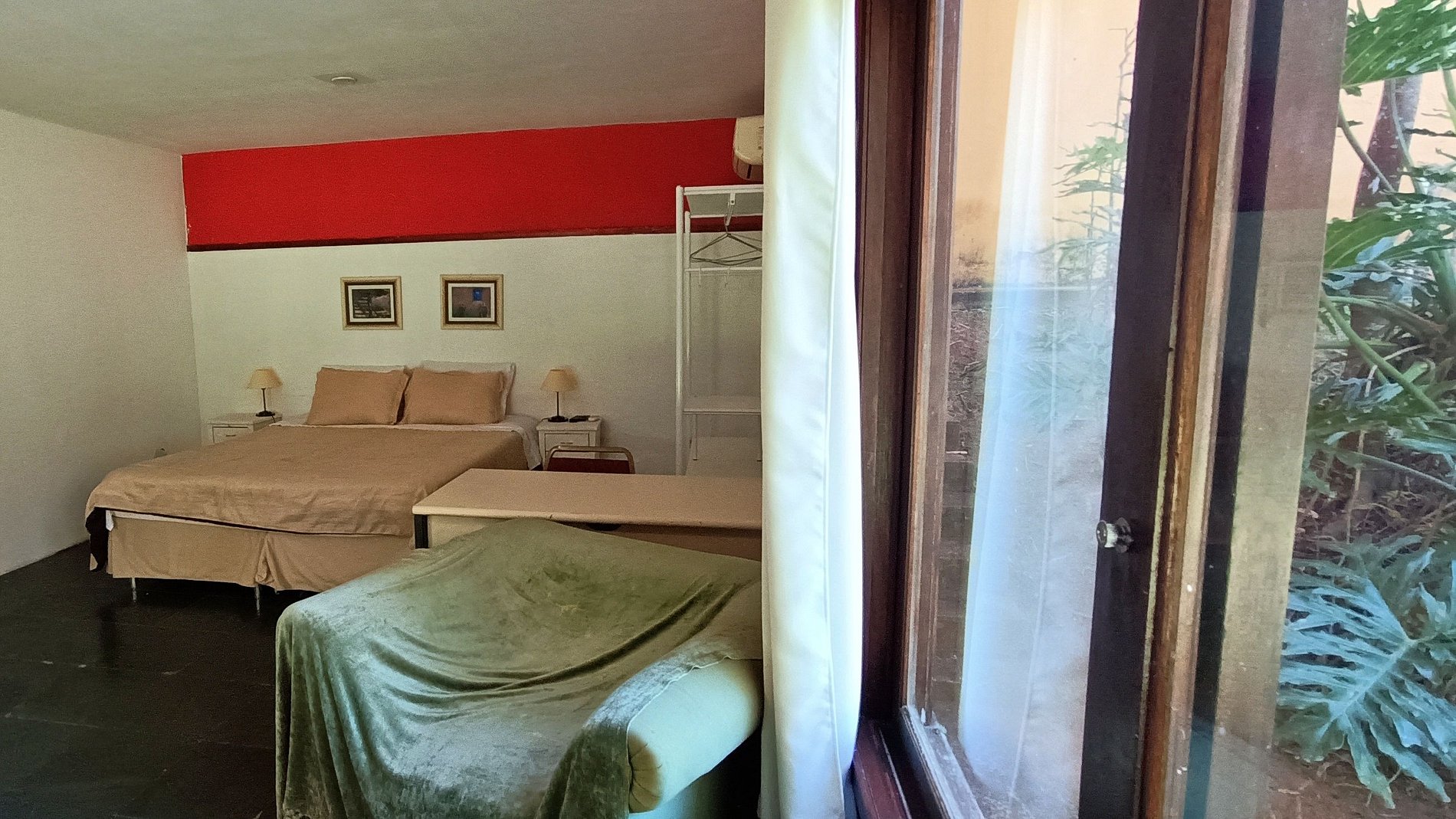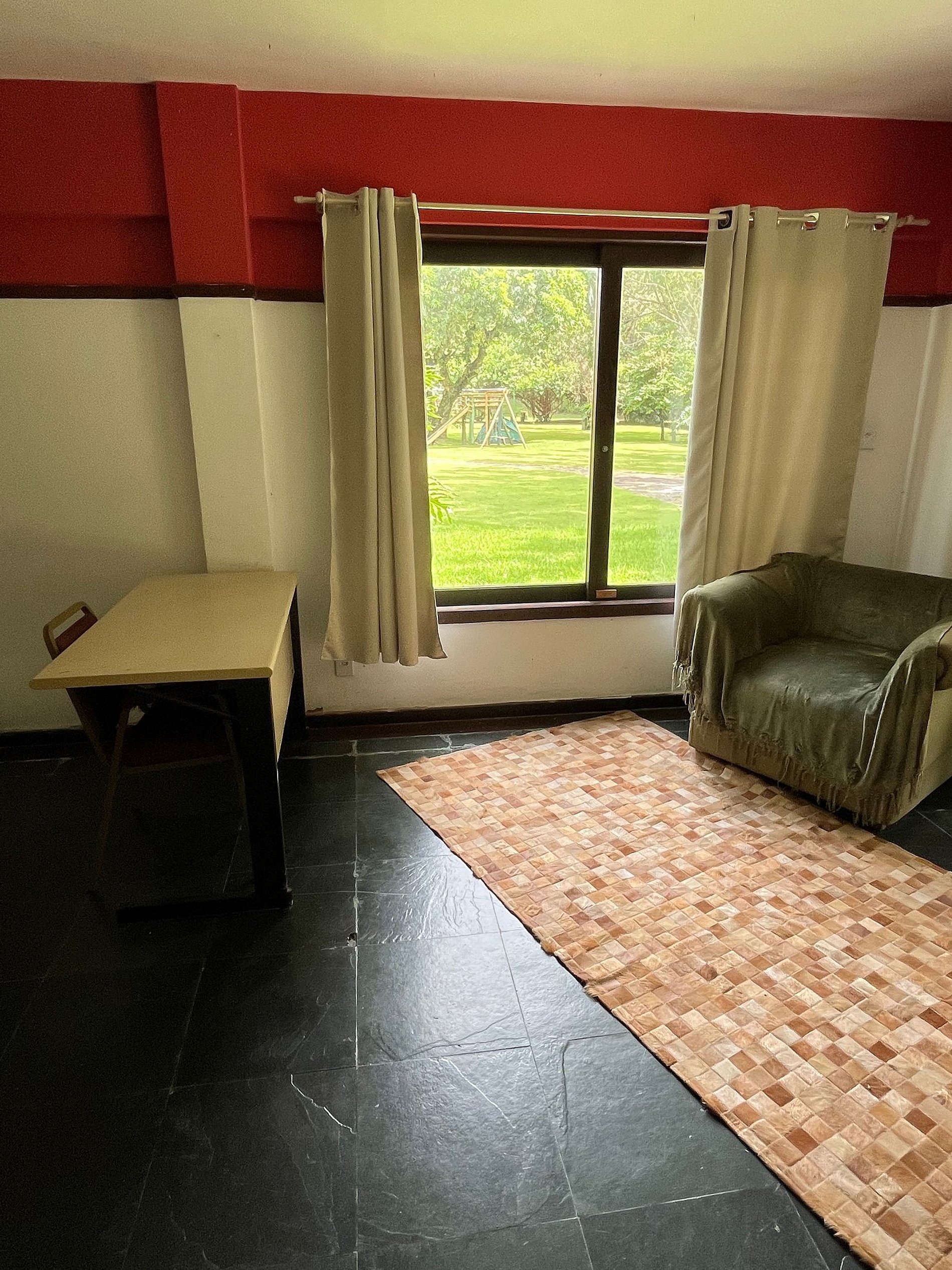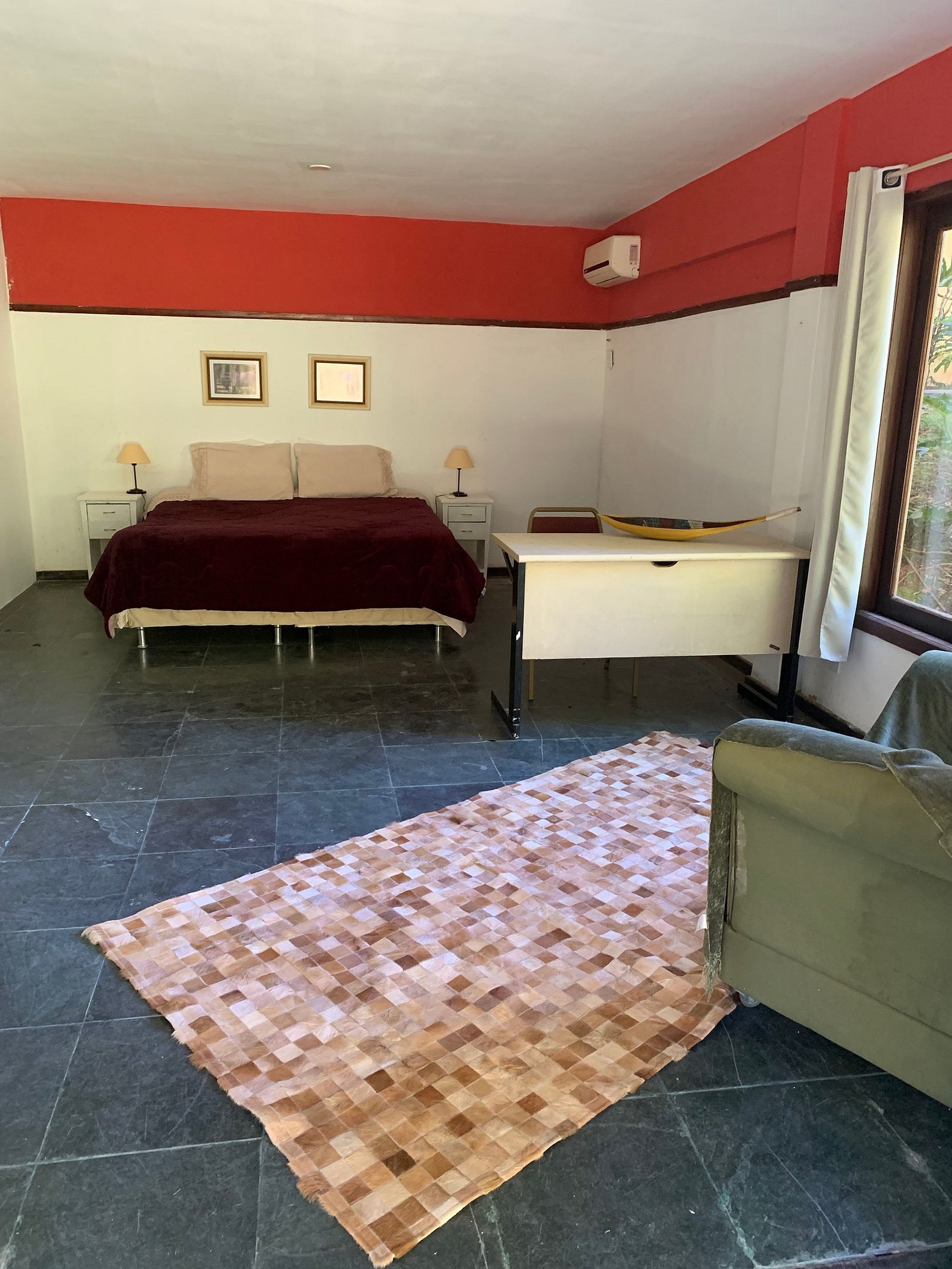 Estúdio ideal para Casal com 2 filhos. Acomoda até 6 pessoas usando o sofá cama da sala. Ar condicionado, cama de casal king size e beliche para dois. Sala com sofás, Parede completa de livros, TV, mesa de jogos e sinuca oficial. Copa completa com fogão elétrico duas bocas e frigobar, louça talheres, panela e frigideira. Varandão de frente para o lago particular para pesca e caiaque (sem custo adicional)