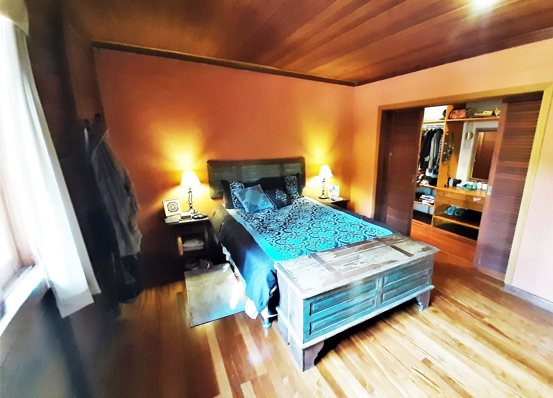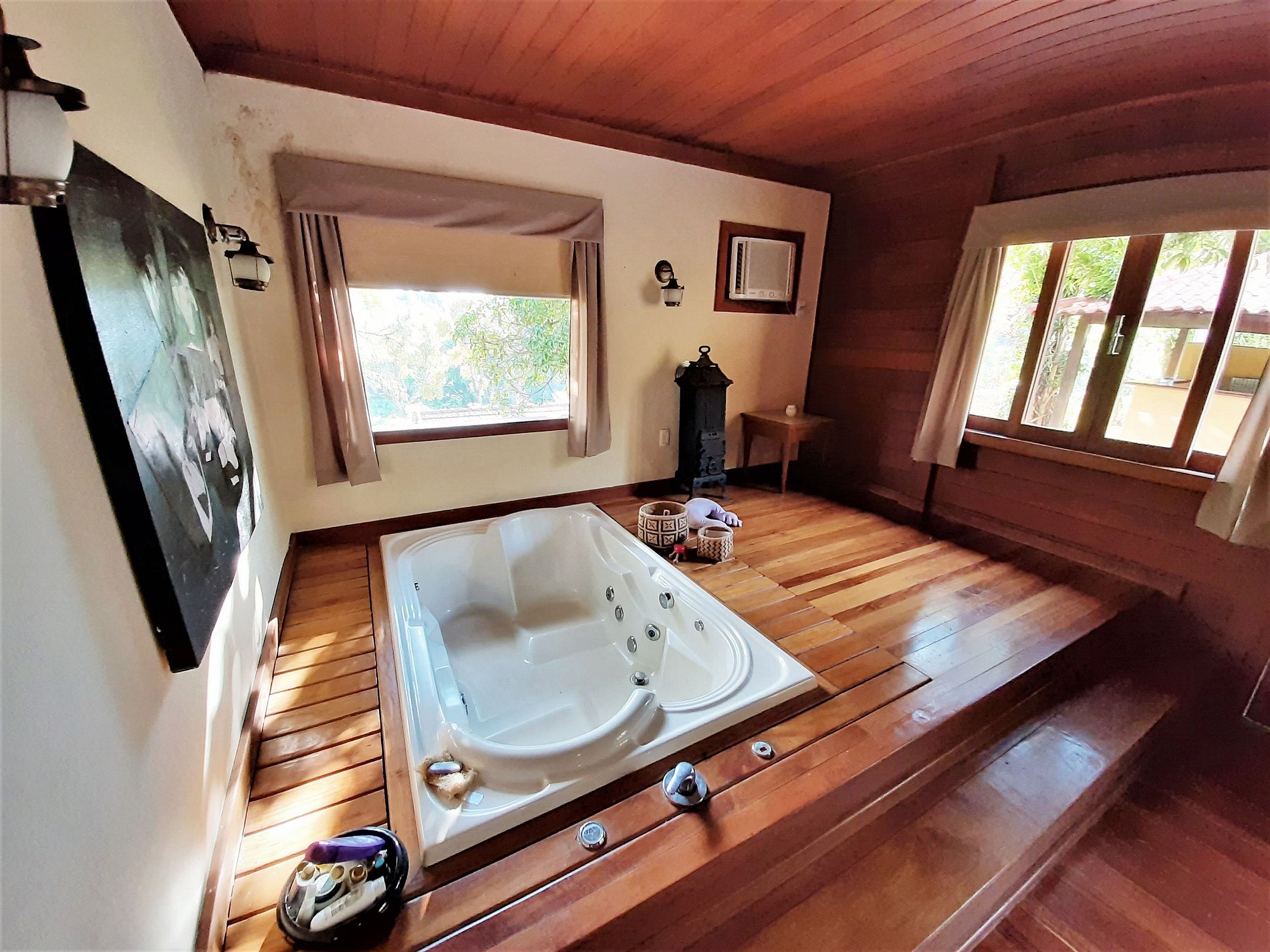 Suite com hidromassagem em deco interno de madeira, em frente cama do casal.Closet e ar-condicionado.