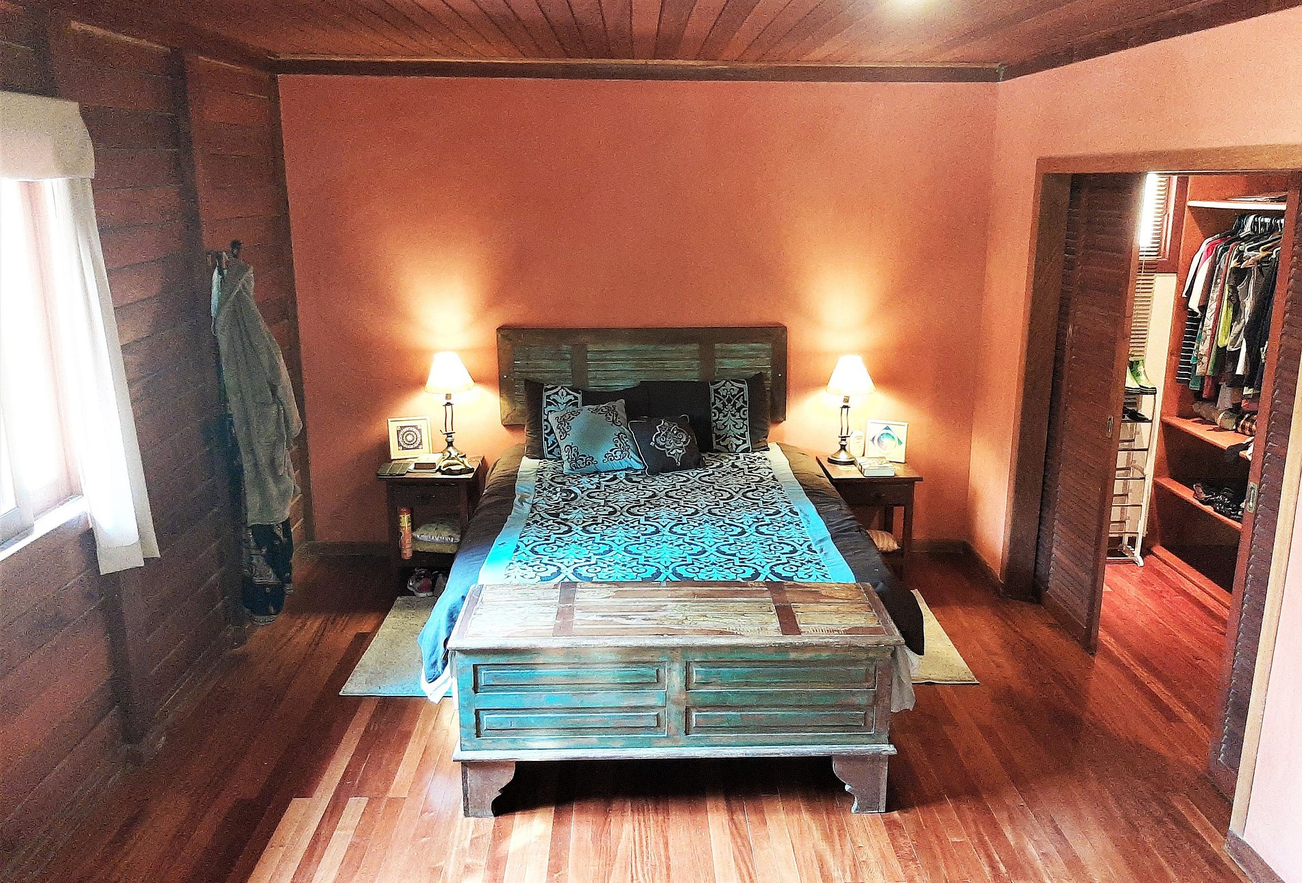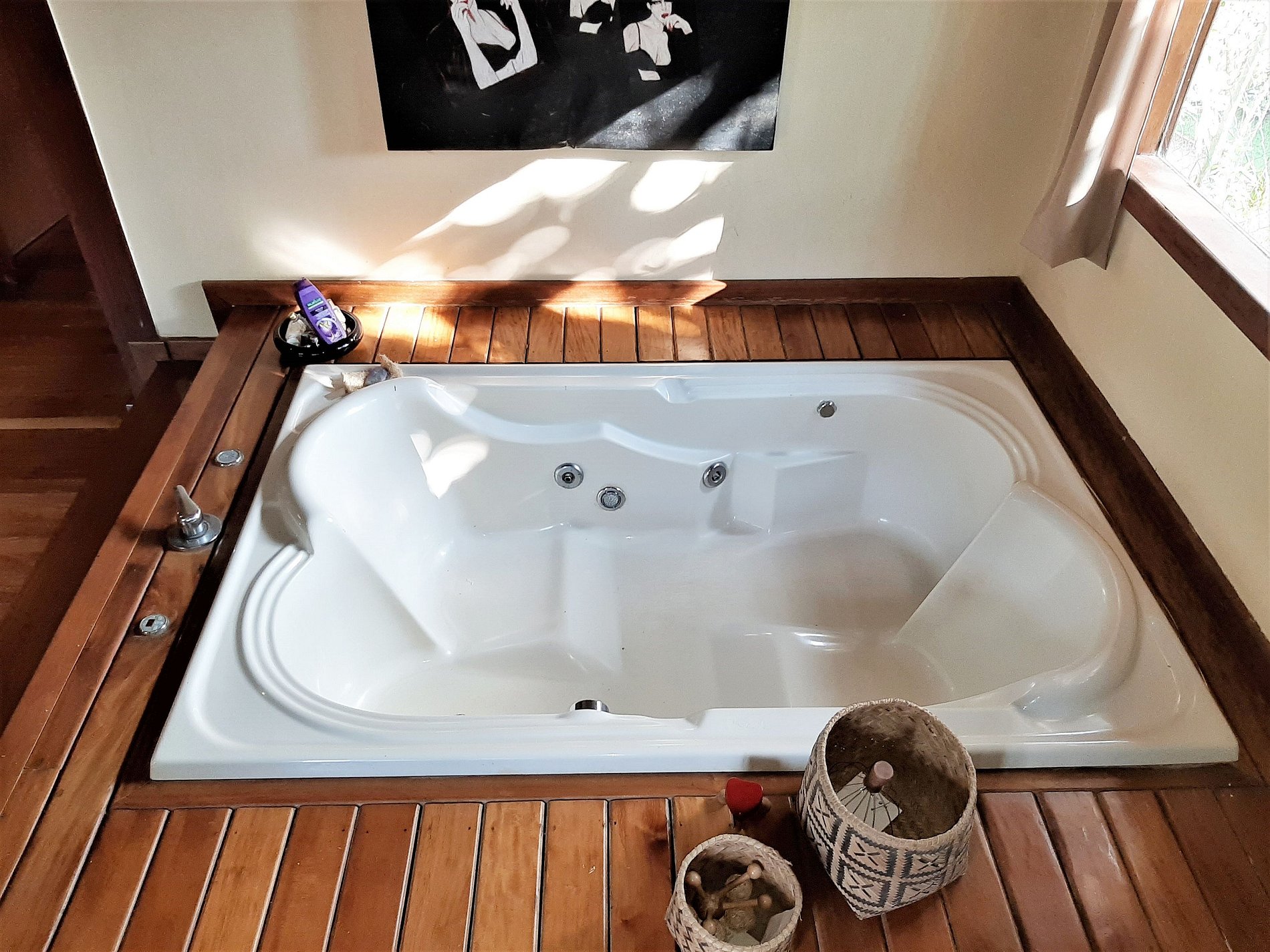 Suite com hidromassagem em deco interno de madeira, em frente cama do casal.Closet e ar-condicionado.