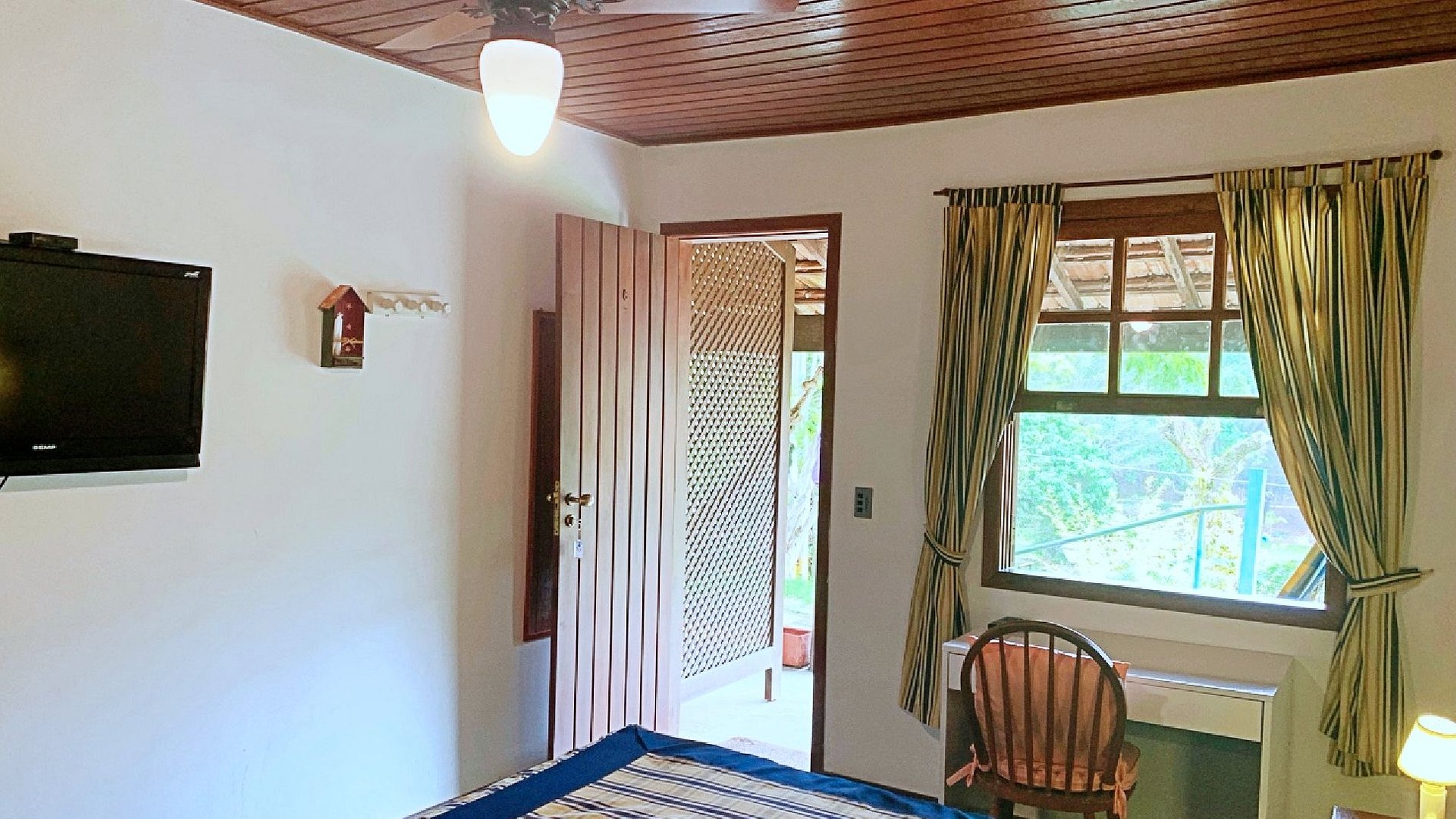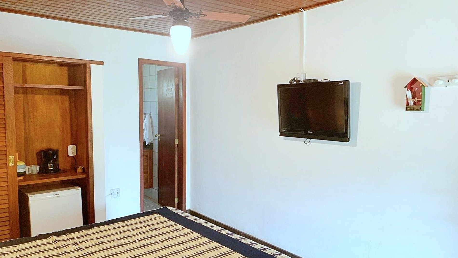 Cama box king. Roupa de cama banho, banheiro privativo com sabonete, papel higiênico. TV 32 polegadas com canais a cabo streaming Wi-fi de alta velocidade. Escrivaninha para computador, com cadeira Microondas. Louça, talheres, copos e taças de vinho Frigobar. Ventilador de teto e aquecedor elétrico. Cafeteira com café, açúcar e adoçante Varanda com rede e mesinha para refeições. Área de lazer com piscina, sauna, vôlei, jardins e lago particular para pesca e caiaque.