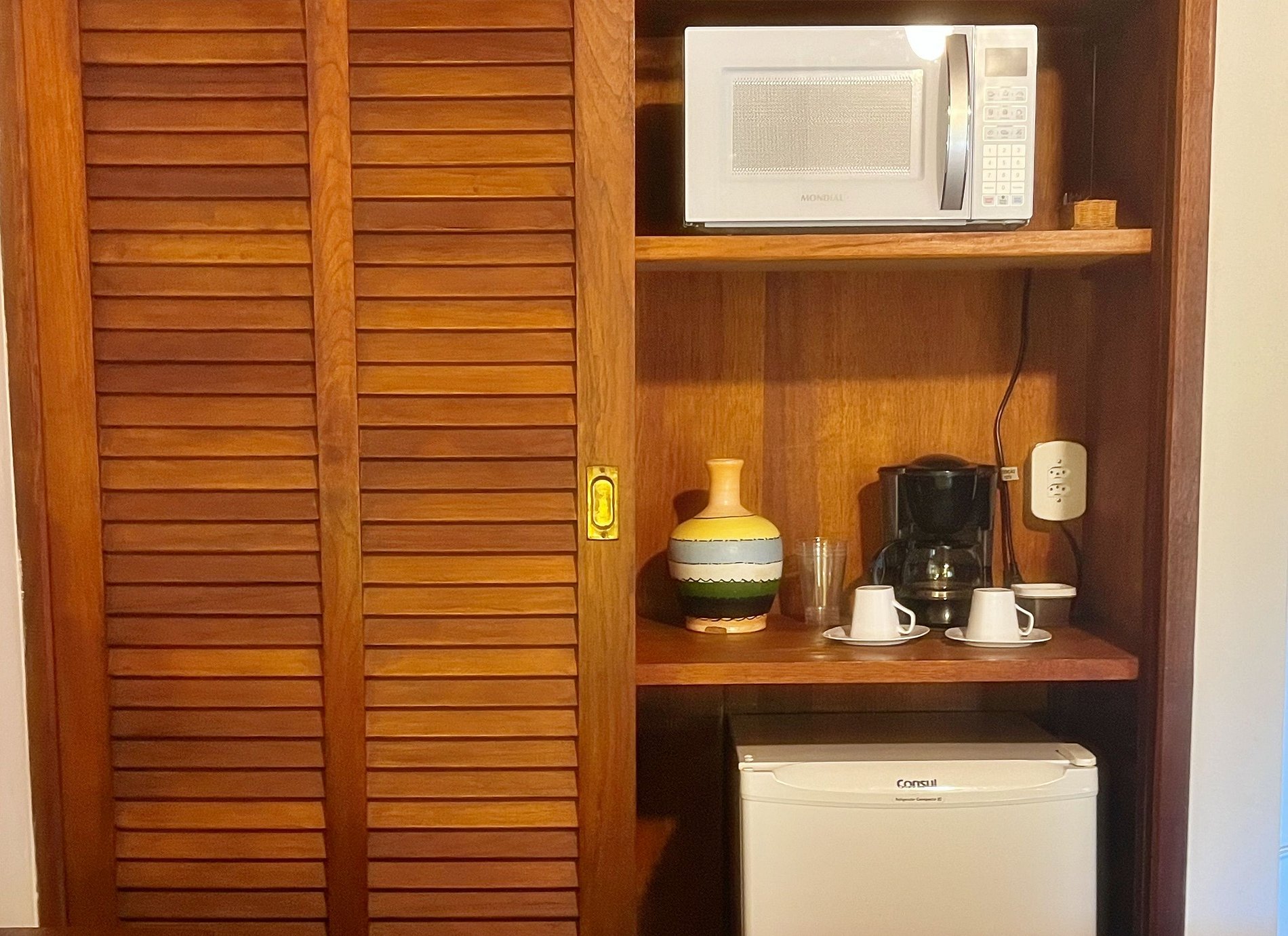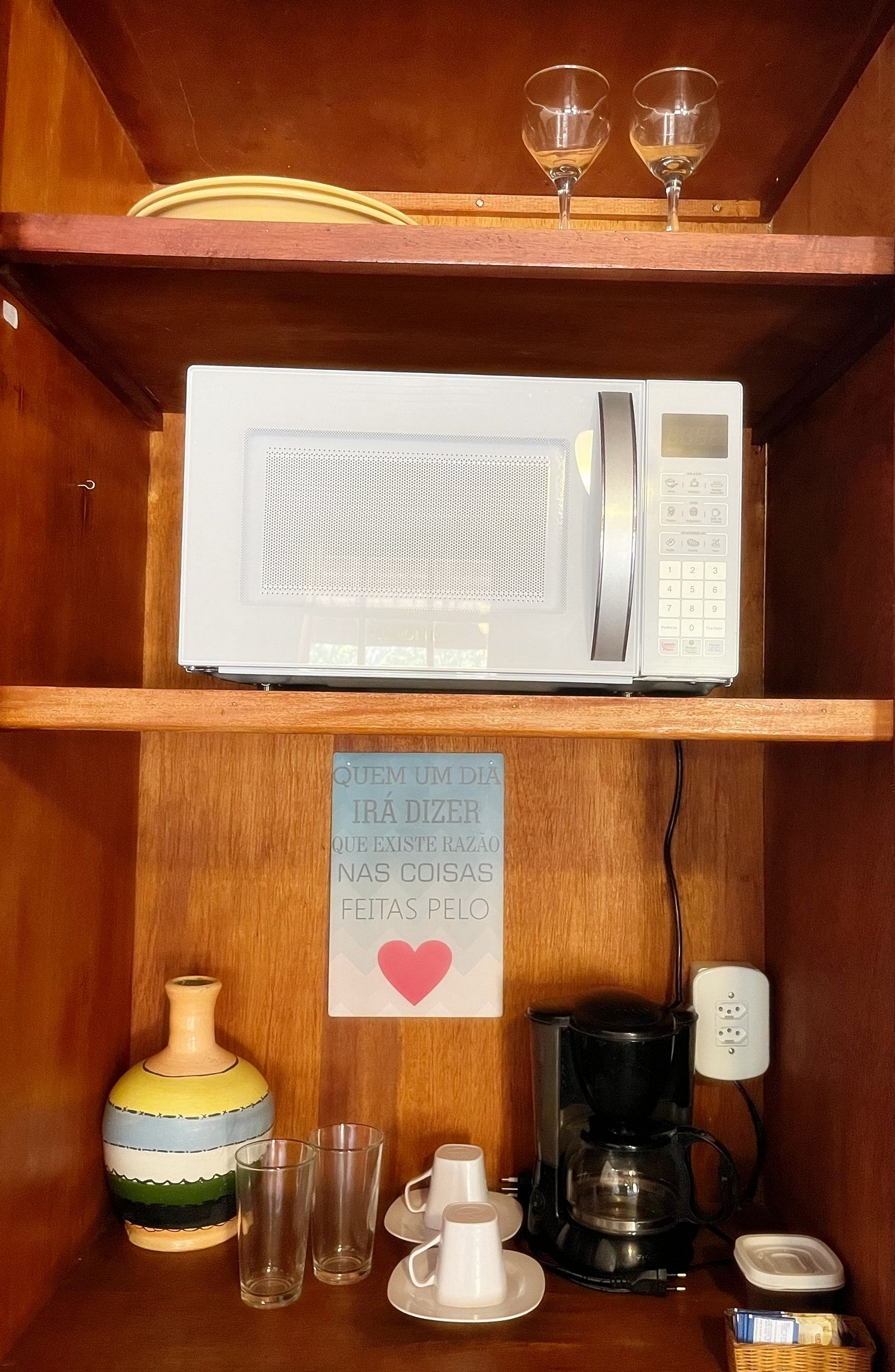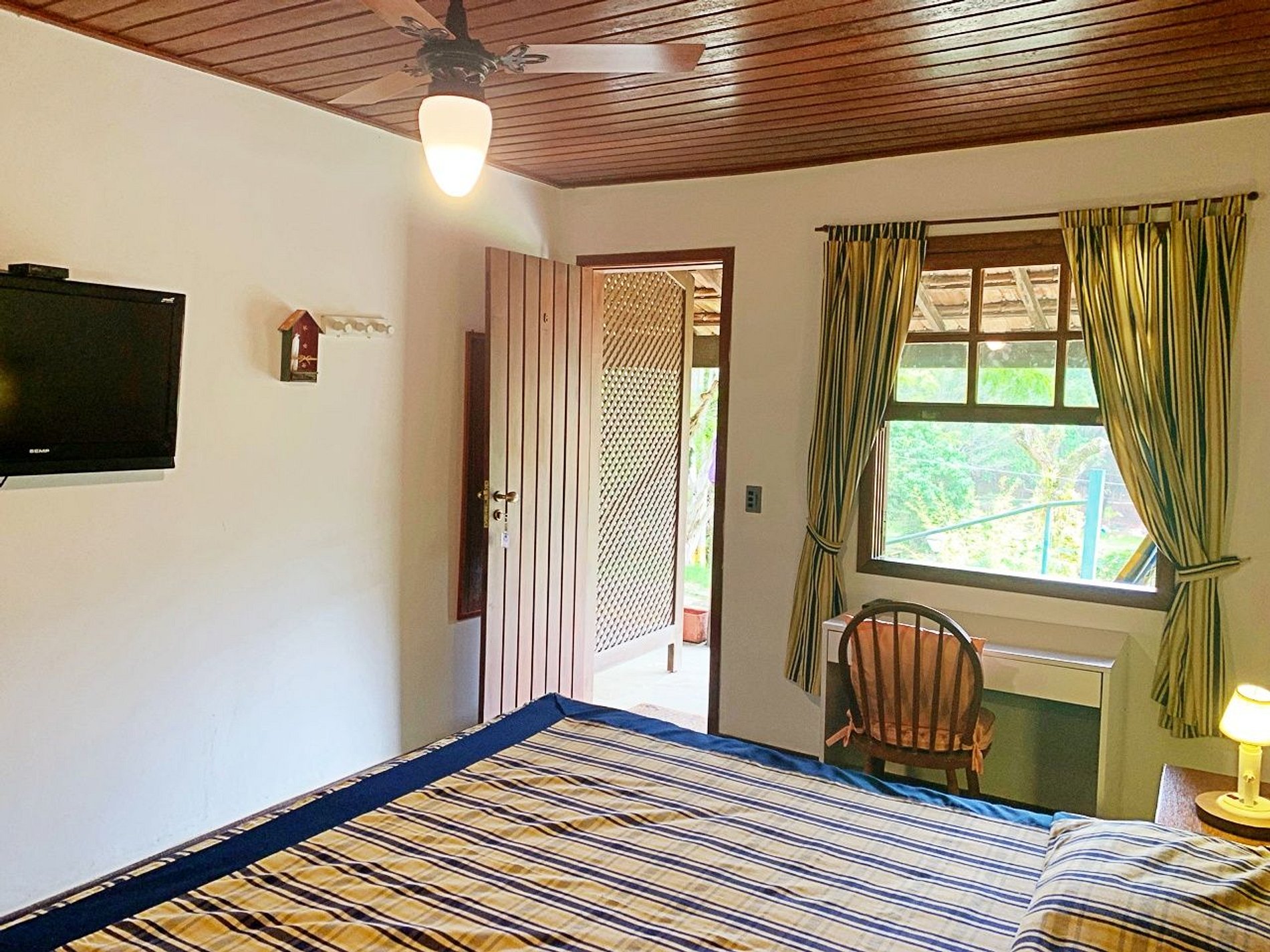 Cama box king. Roupa de cama banho, banheiro privativo com sabonete, papel higiênico. TV 32 polegadas com canais a cabo streaming Wi-fi de alta velocidade. Escrivaninha para computador, com cadeira Microondas. Louça, talheres, copos e taças de vinho Frigobar. Ventilador de teto e aquecedor elétrico. Cafeteira com café, açúcar e adoçante Varanda com rede e mesinha para refeições. Área de lazer com piscina, sauna, vôlei, jardins e lago particular para pesca e caiaque.