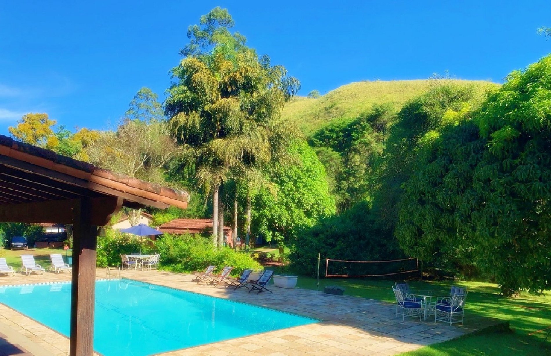 Cama box king. Roupa de cama banho, banheiro privativo com sabonete, papel higiênico. TV 32 polegadas com canais a cabo streaming Wi-fi de alta velocidade. Escrivaninha para computador, com cadeira Microondas. Louça, talheres, copos e taças de vinho Frigobar. Ventilador de teto e aquecedor elétrico. Cafeteira com café, açúcar e adoçante Varanda com rede e mesinha para refeições. Área de lazer com piscina, sauna, vôlei, jardins e lago particular para pesca e caiaque